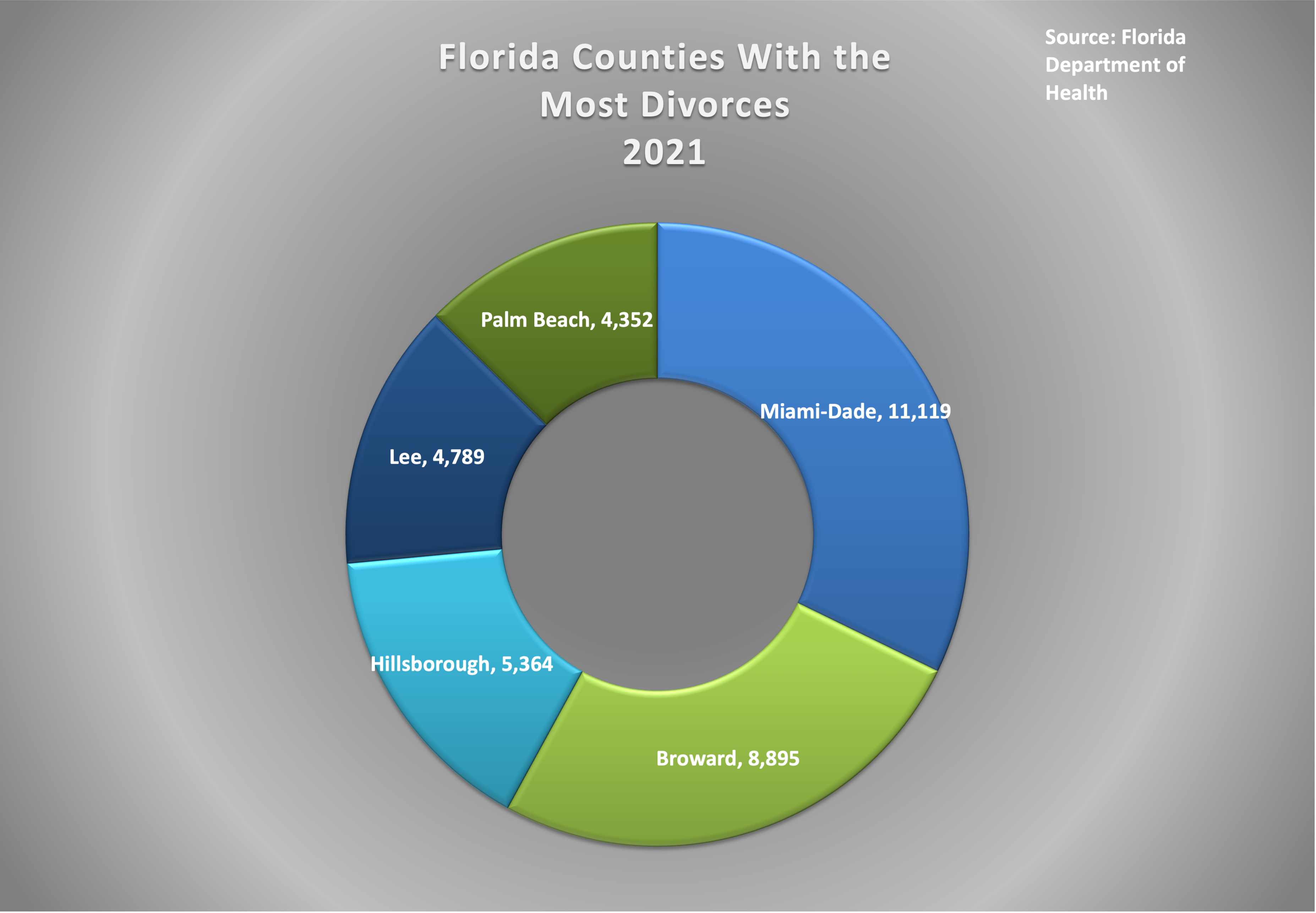 Not surprisingly, the more populated areas of the state have more people, thus have more marriages and divorces. 2021 data from the FLDOH found that Miami-Dade County had the most divorces, with 11,119. Other leaders included Broward County, Hillsborough County, Lee County, and Palm Beach County.