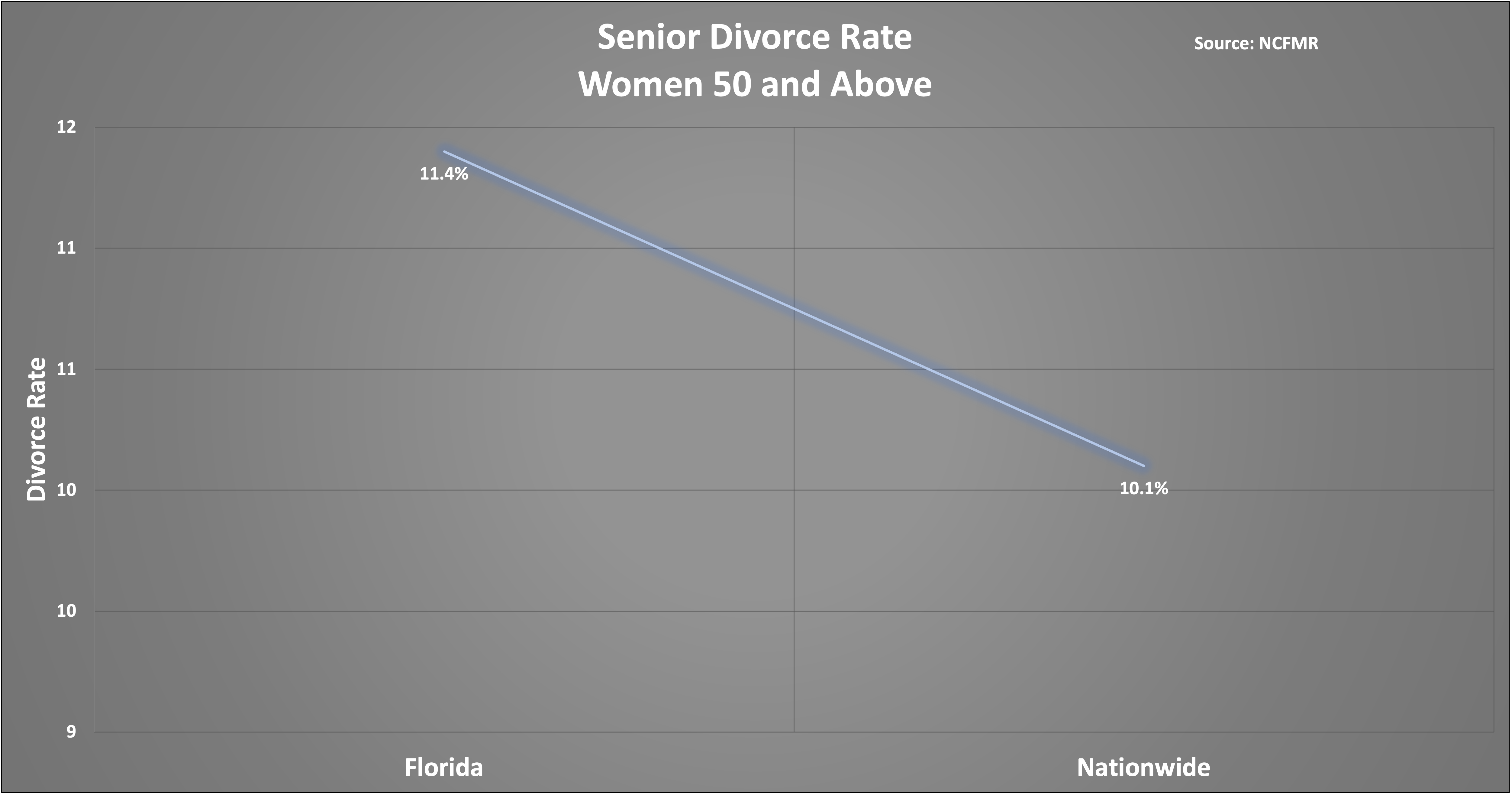 According to a 2017 study from the National Centers for Family and Marriage Research, the divorce rate among women 50 and older in Florida was 11.4%. The national average hovered at around 10.1%.